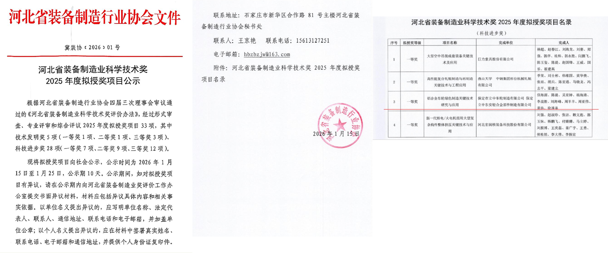 2026年1月15日,河北省裝備制造業(yè)科學(xué)技術(shù)獎2025年度擬授獎項目公示,由保定市立中車輪制造有限公司和保定立中東安輕合金部件制造有限公司共同完成的“鋁合金車輪綠色制造關(guān)鍵技術(shù)研究與應(yīng)用”項目,榮獲科技進步獎一等獎。